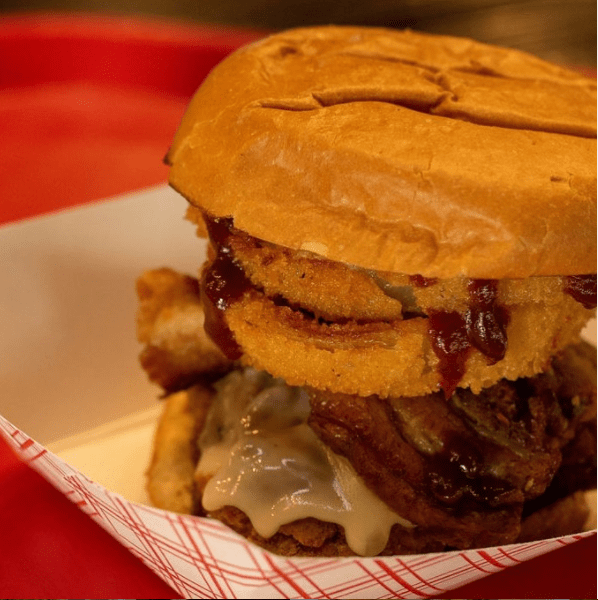 The Alchemy Burger on a toasted potato roll, with Cabot cheddar, smoked bacon, little gem lettuce, smoked miso mayo & pickled red onion. Delicious any time of day!