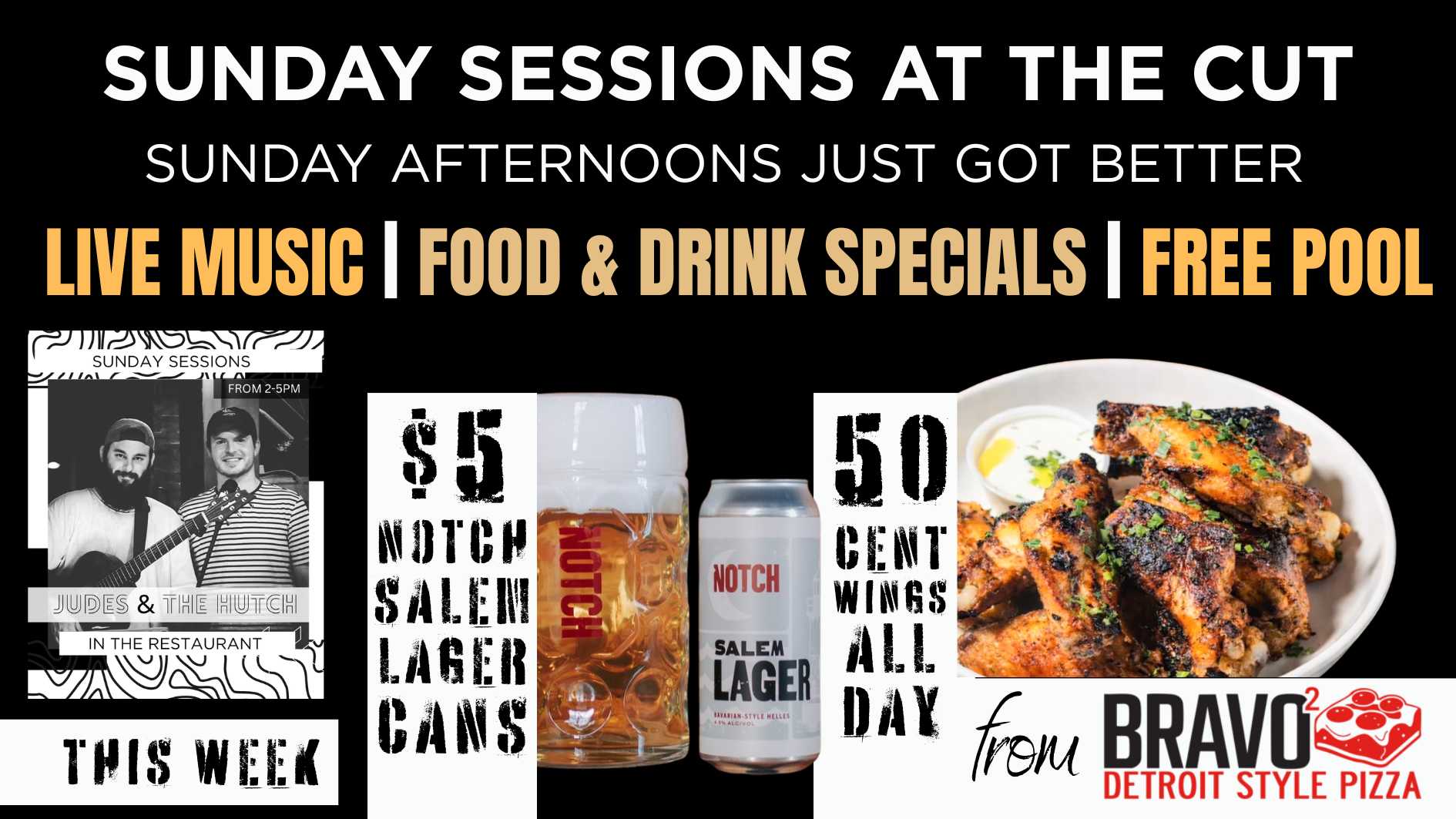 Plus, we’ll have Sunday Sessions in the restaurant with 50 cent wings, free pool, live music from Judes & The Hutch (2-5pm) and more! No cover. Come enjoy the neighborhood bar hang vibe!